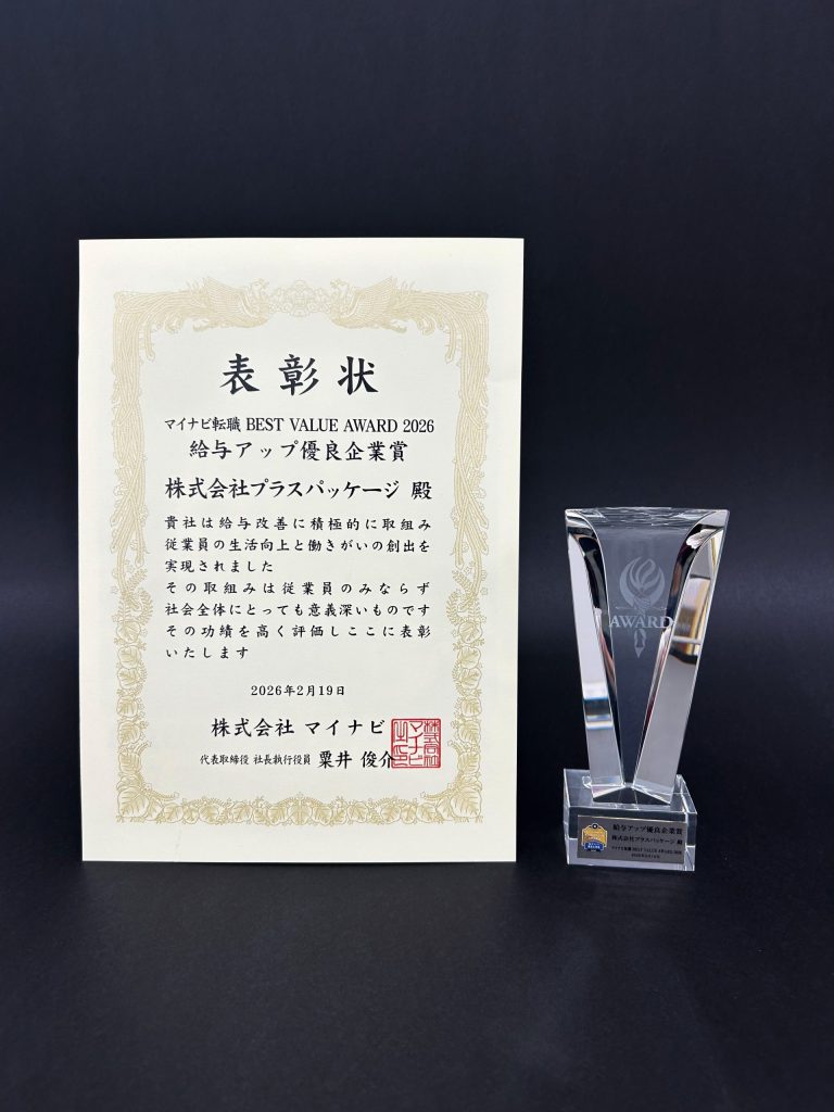 先日受賞したマイナビ転職BEST VALUE AWARD2026「給与アップ優良企業賞」の表彰状とトロフィーをいただきました。