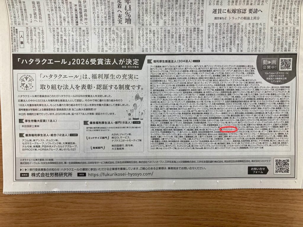 この度、ハタラクエール2026の福利厚生推進法人に認証いただきました!